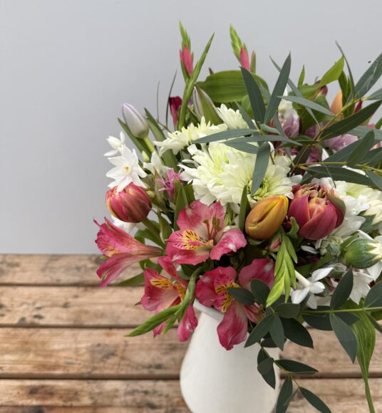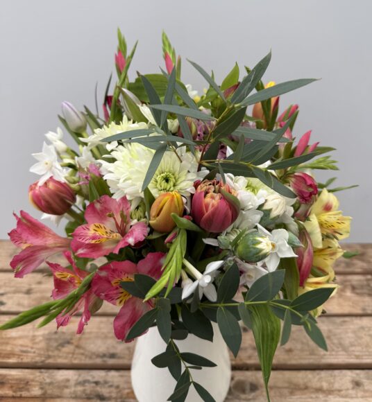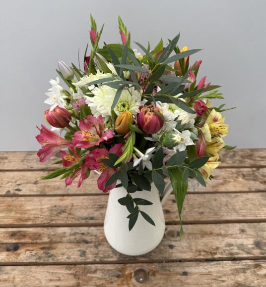 The flower contents can vary throughout the months, but for November time the Cornish Flowers – A Mixed Bunch is likely to include a selection from Cornish Alstroemeria, Cornish Scented Pinks, Cornish scented Narcissi, Cornish Snapdragons, Crysanthemums and Cornish Nerines. We will choose at least 4 varieties of flowers to go into the bouquet.