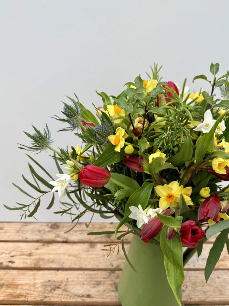 The flower contents can vary throughout the months, but for the early part of the year the Cornish Flowers – A Mixed Bunch is likely to include a selection from Cornish Alstroemeria, , Cornish scented Narcissi, Cornish Daffodils, Tulips from Lincolnshire and any other flowers we may be able to source locally. It was also include Cornish foliage. We will choose at least 4 varieties of flowers to go into the bouquet.