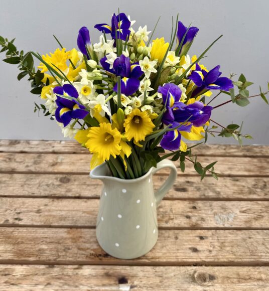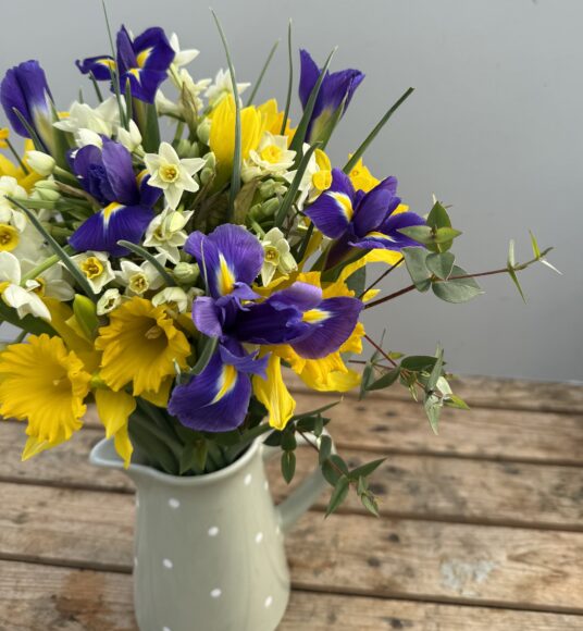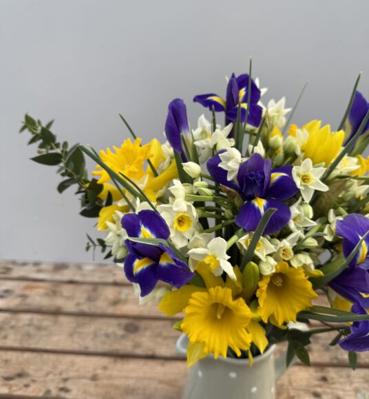 This gorgeous bunch will have 20 stems of white/cream highly Scented Narcissi, 10 stems of Daffodils and 7 stems of Blue Iris and some lovely fresh foliage.