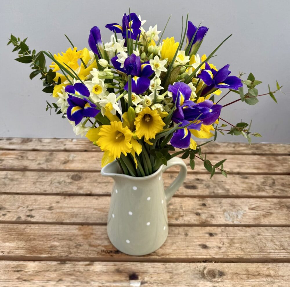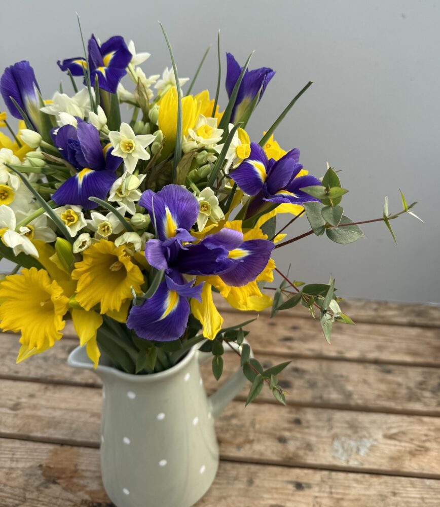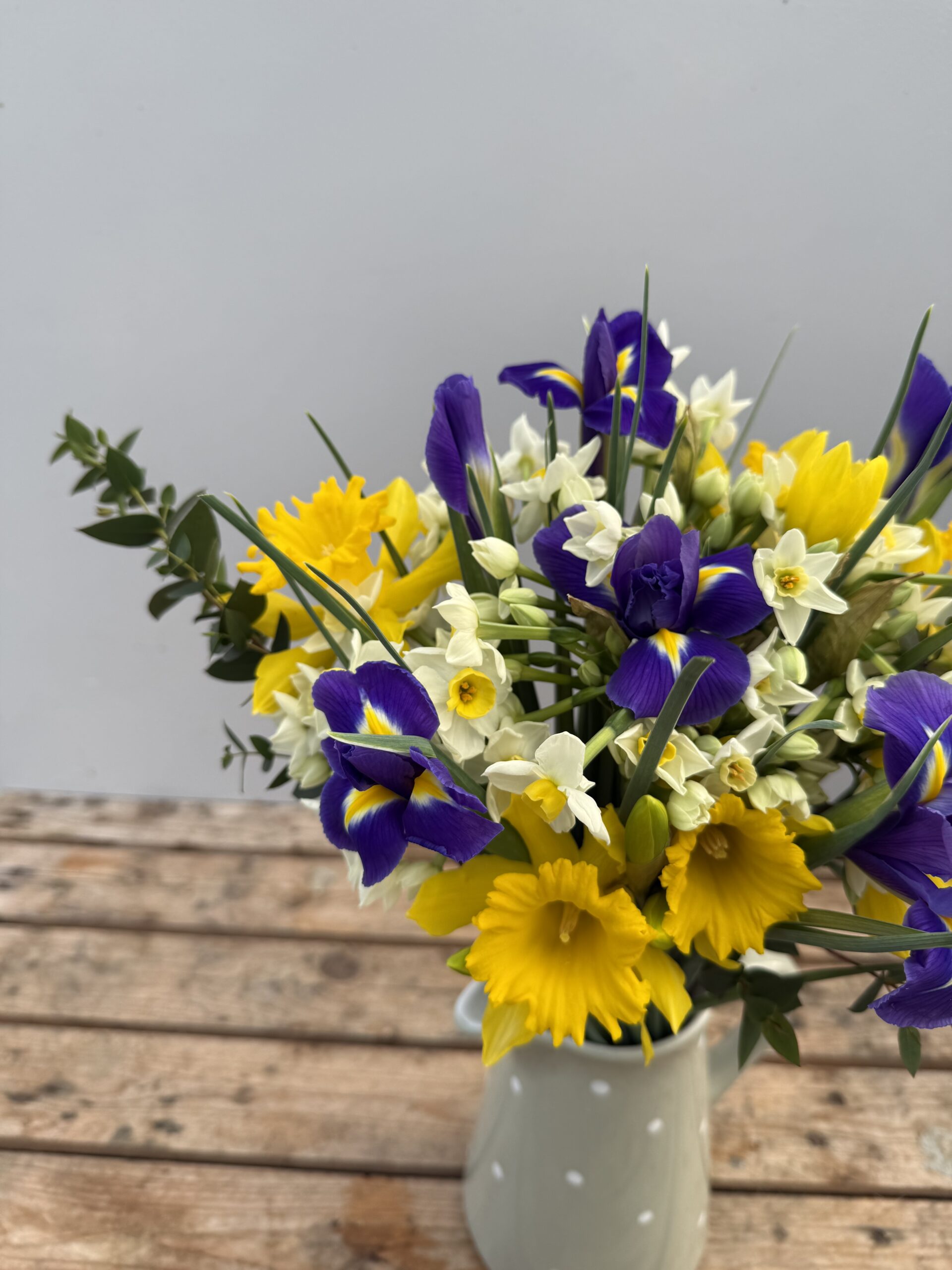 This gorgeous bunch will have 20 stems of white/cream highly Scented Narcissi, 10 stems of Daffodils and 7 stems of Blue Iris and some lovely fresh foliage.