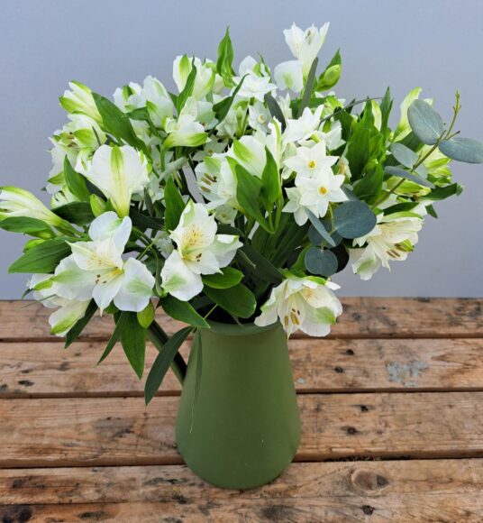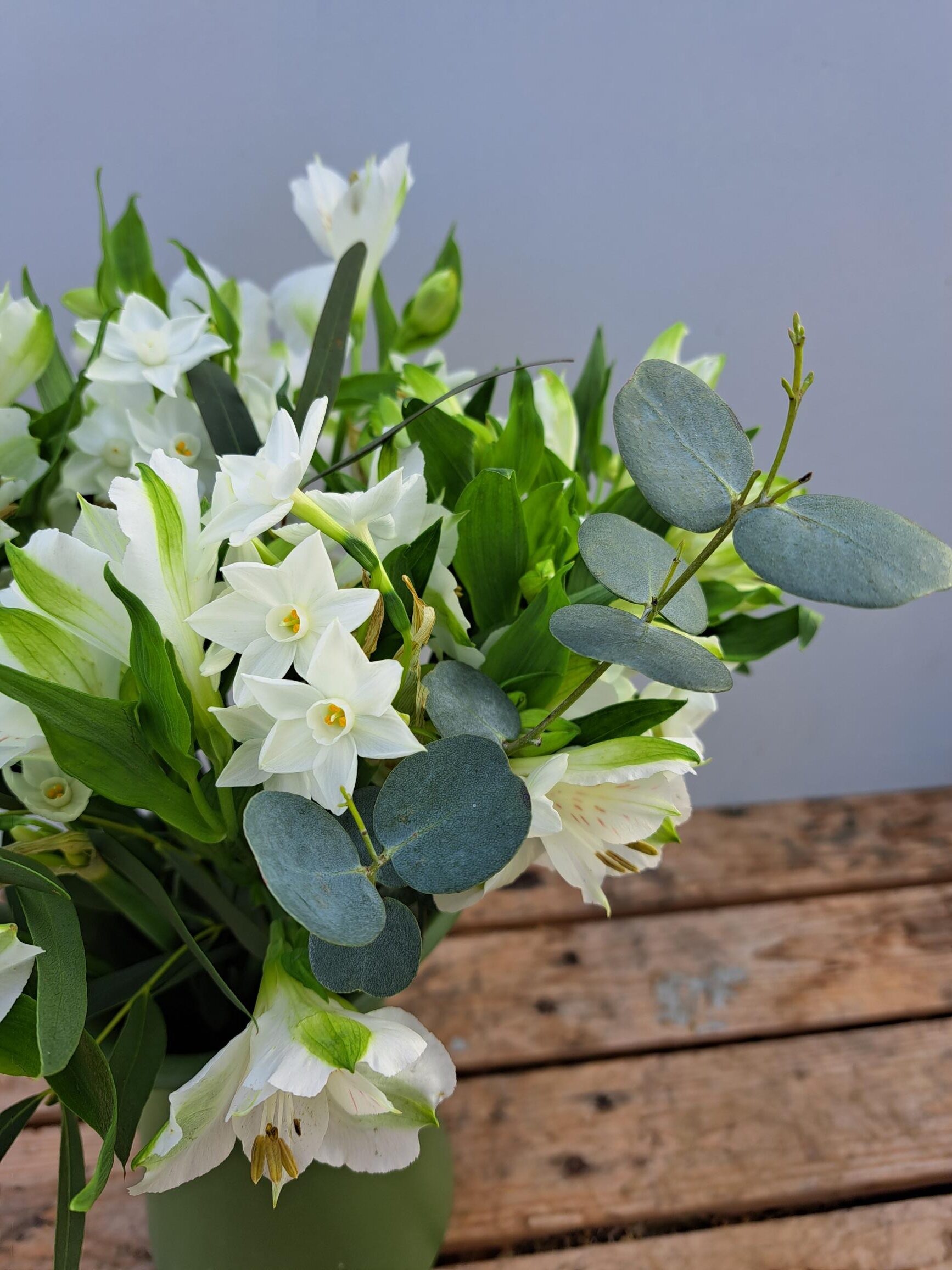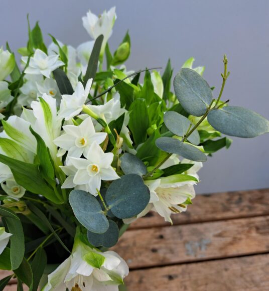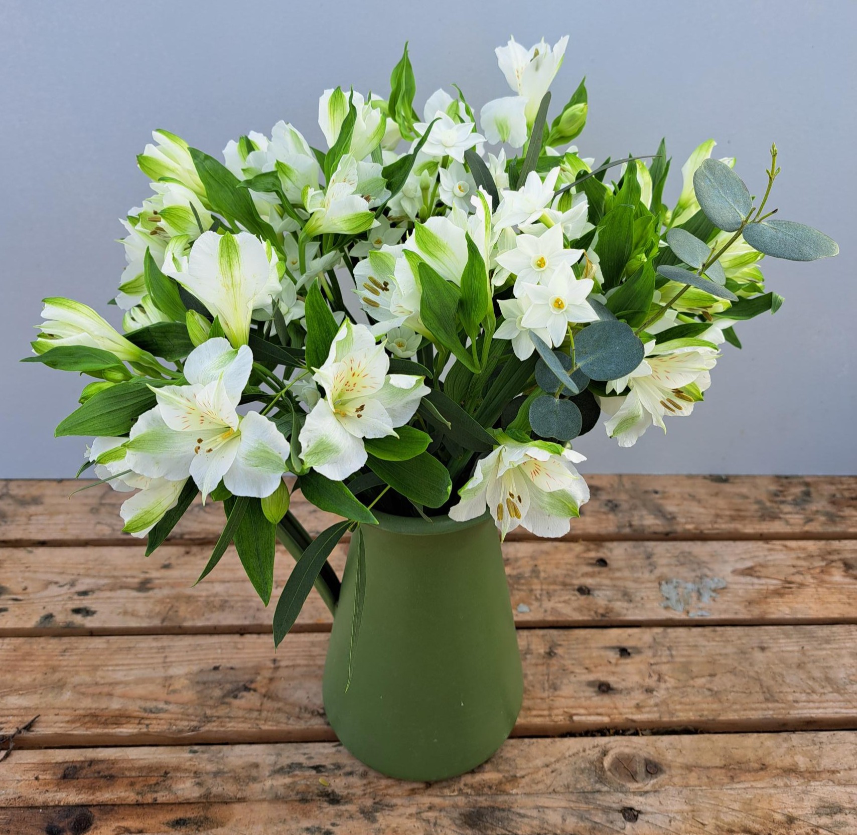 We will send 8 stems of White Alstroemeria with 20 stems of white highly Scented Narcissi and some lovely fresh foliage.