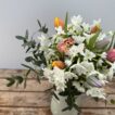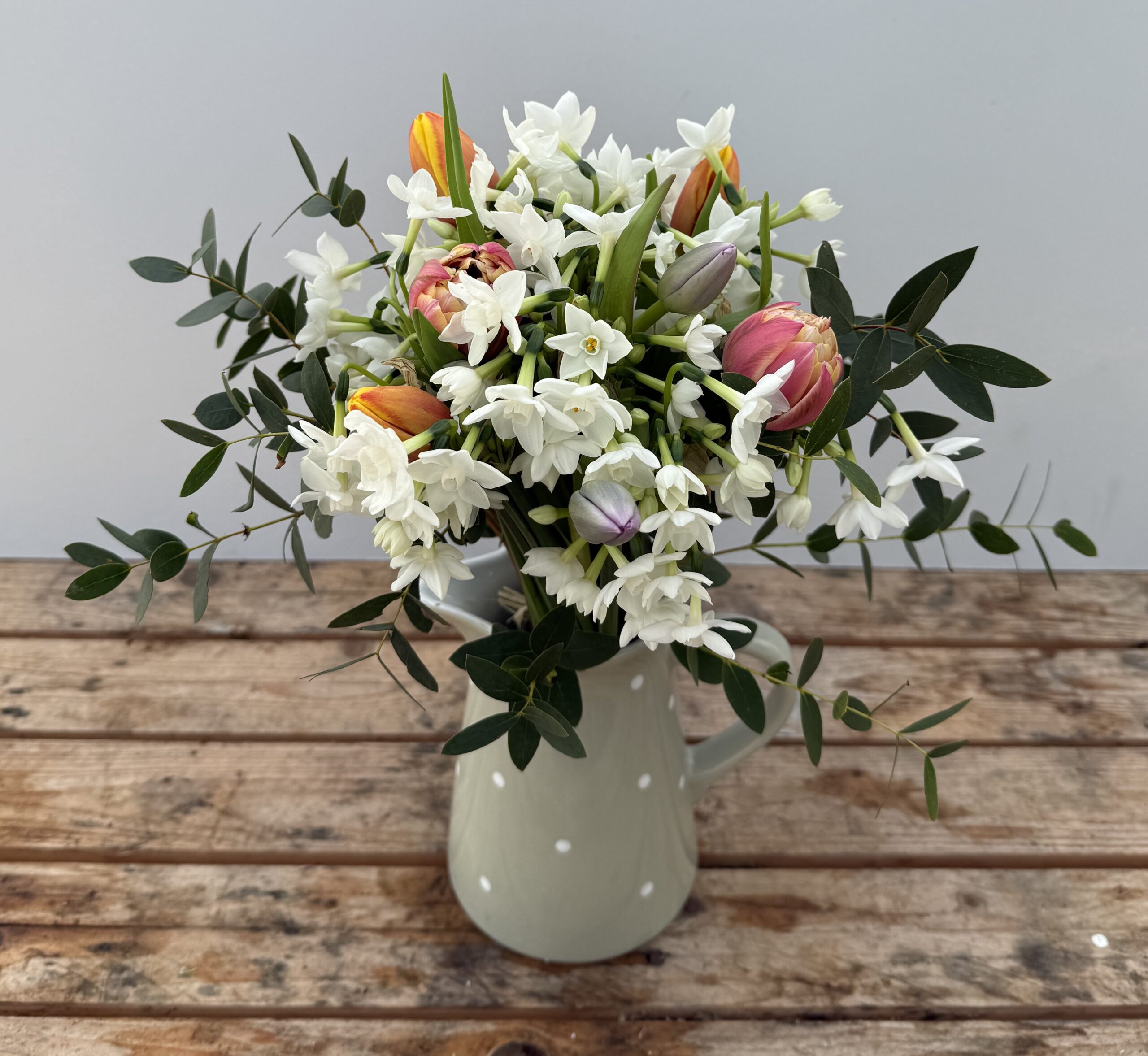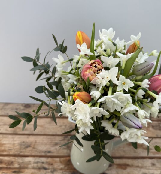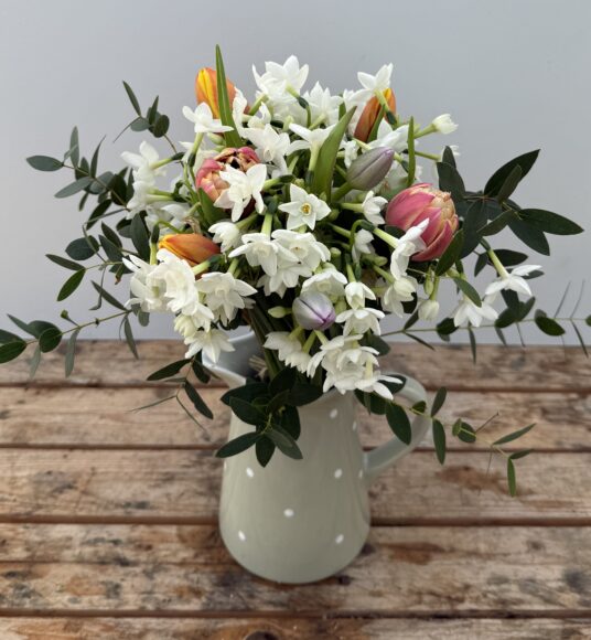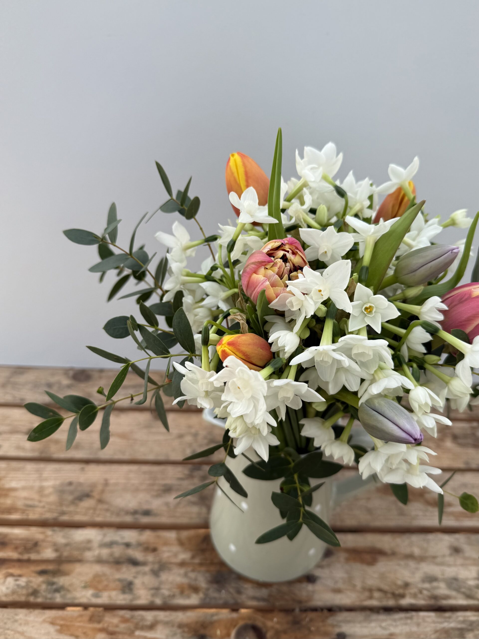 This gorgeous bunch will have 30 stems of white/cream highly Scented Narcissi, 7 stems of mixed colour Tulips and some lovely fresh foliage.