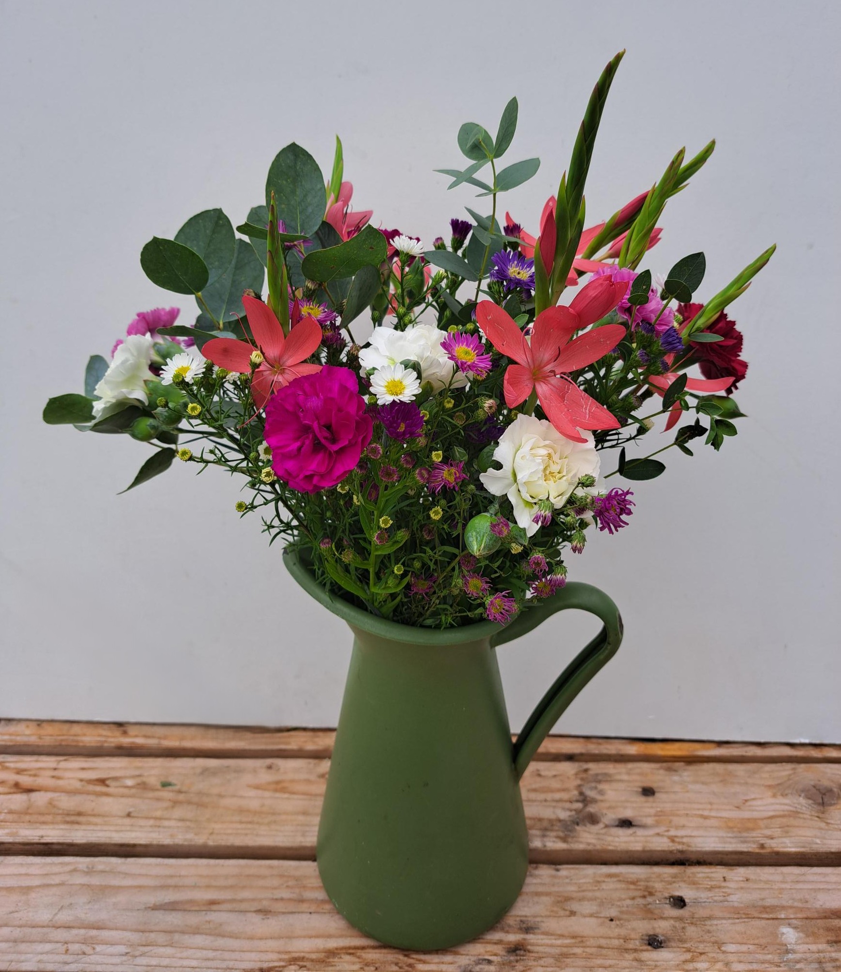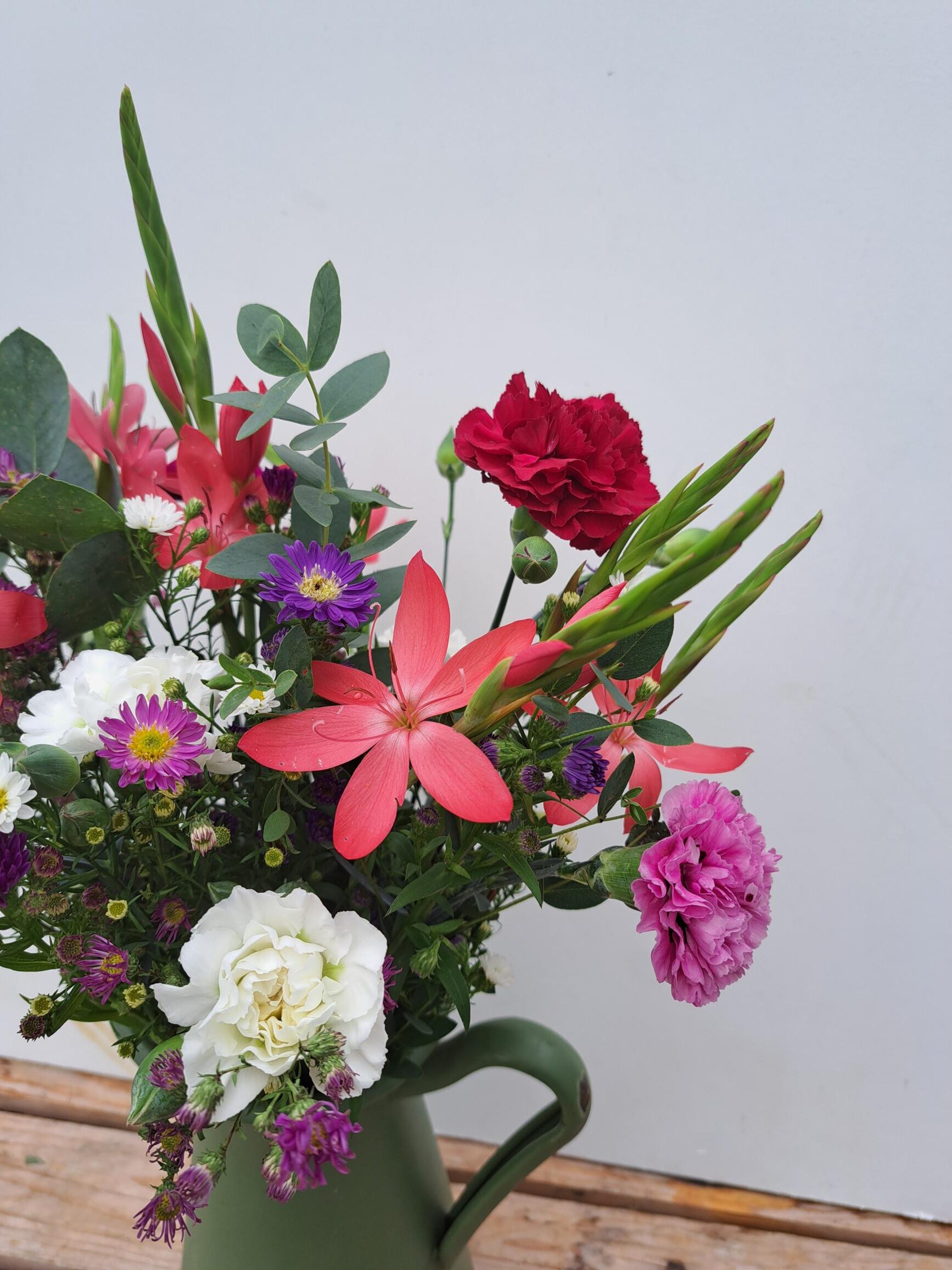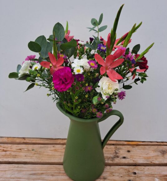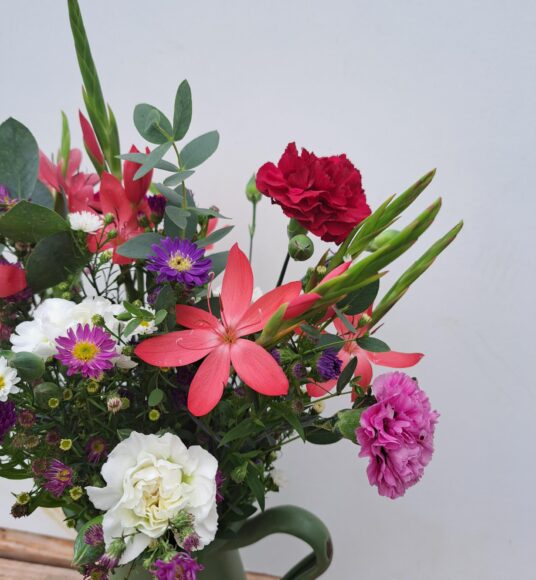 The Scented Pinks are grown in polytunnels right next to the flower barn where we prepare our orders and you simply cannot get fresher than that! These wonderful flowers are in season from May – October and we grow a range of colours including pale pink, white, lilac, purple and red. Although they are called ‘Pinks’ their name actually comes from the ‘pinked’ edges of their petals. ‘Pinks’ have a lovely clove-like fragrance and a good vase life.