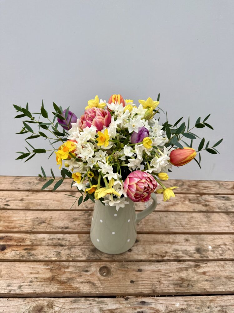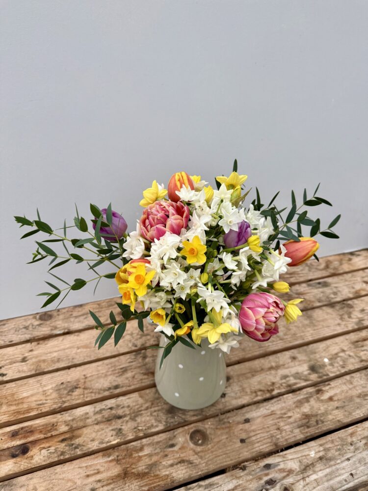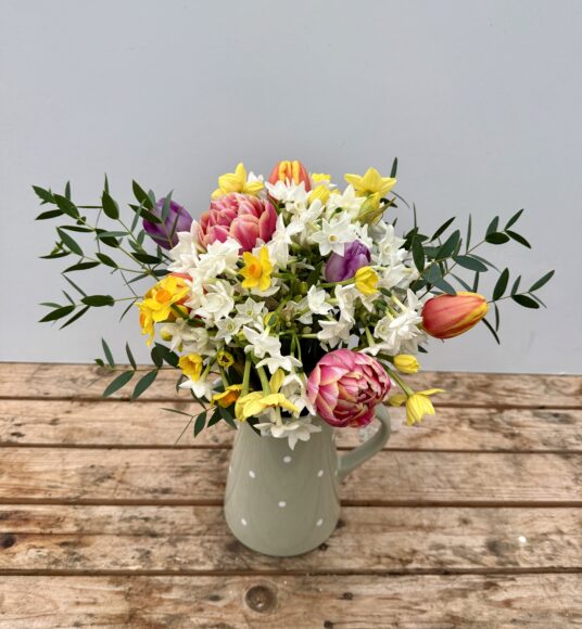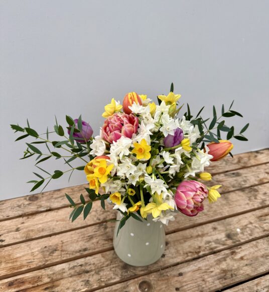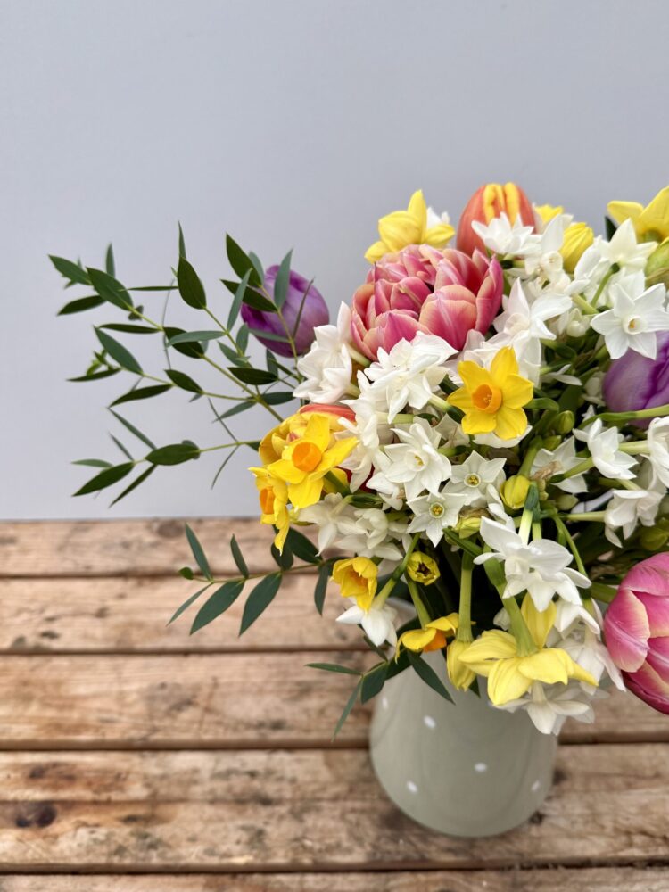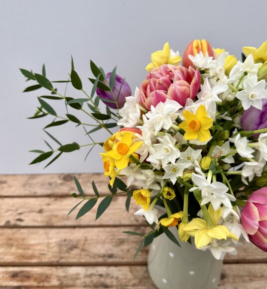 This gorgeous bunch will have 30 stems of highly Scented Narcissi, 7 stems of mixed colour Tulips and some lovely fresh foliage.