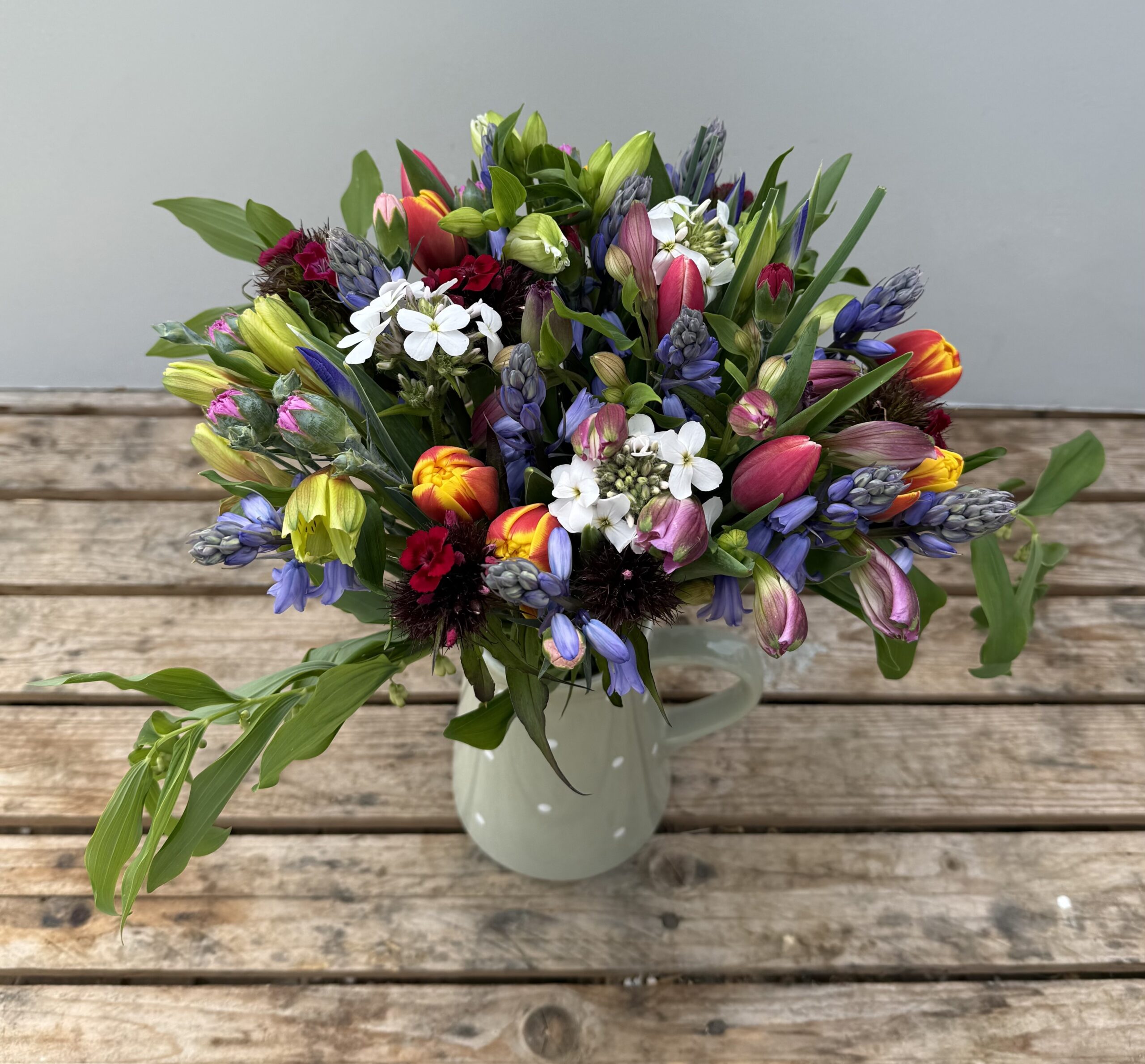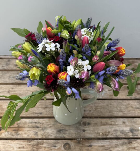 The flower contents can vary throughout the months, but for April into May the Cornish Hand-Tied Bouquet is likely to include a selection from Cornish Alstroemeria, Cornish Solomon Seal, Cornish Scillas, Cornish Scented Pinks, British Tulips, British Iris, Cornish Sweet William, Cornish Sweet Rocket and Cornish Foliage.We will choose at least 4 varieties of flowers to go into the bouquet.