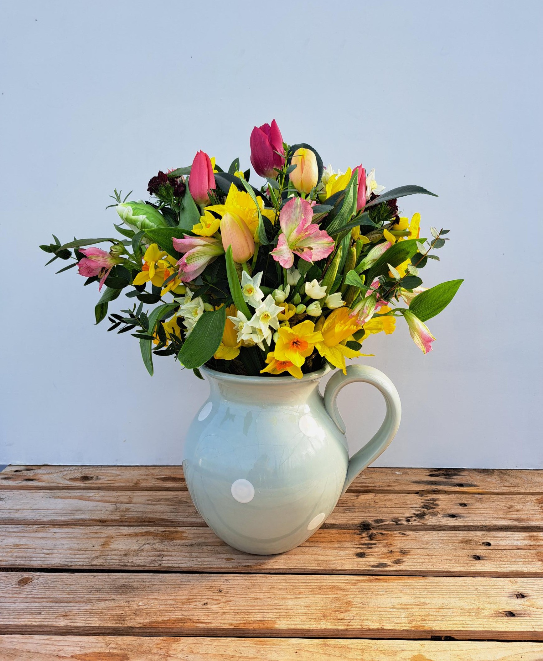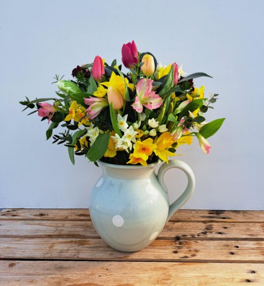 The flower contents can vary throughout the months, but for the first few months of the year the Cornish Hand-Tied Bouquet is likely to include a selection from Cornish Alstroemeria, Cornish Narcissi, British Iris, British Tulips, Cornish Daffodils and Cornish Scillas. We will choose at least 4 varieties of flowers to go into the bouquet.