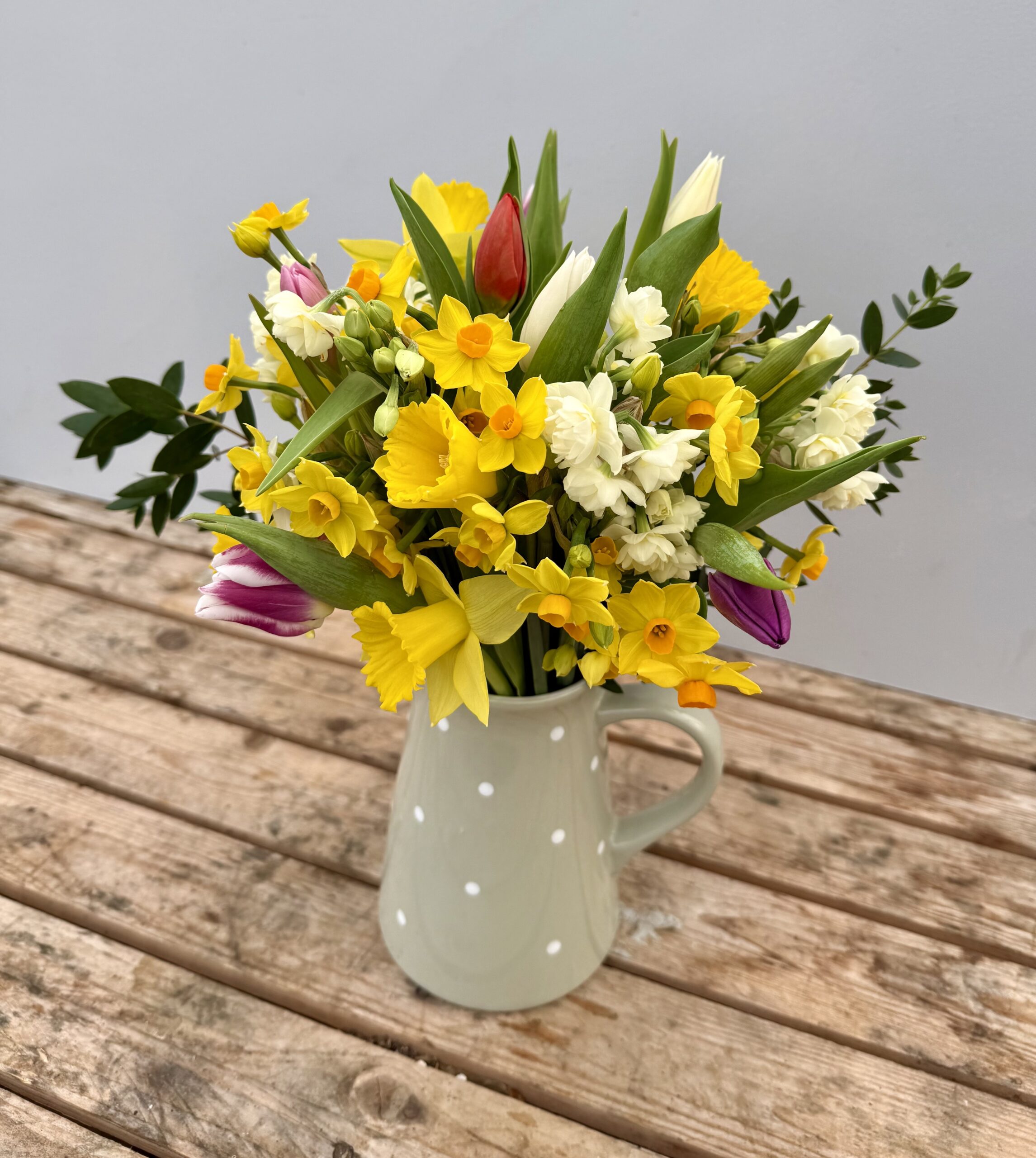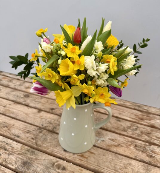 This bouquet features 20 stems of our multi-headed highly scented narcissi, 20 stems of Daffodils (both grown here in Cornwall) with 7 stems of pretty mixed colour Tulips from a farm in Lincolnshire. The Narcissi may be a mixed of the yellow and white and the Daffodils will be single Yellow ones as it is early in the season.