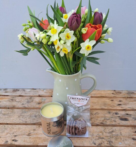We have selected a beautiful bouquet of Scented Narcissi and Tulips, a St Eval Candle and some lovely Trenance flower shaped chocolates to deliver a Cornish treat to your loved one this Valentines Day.