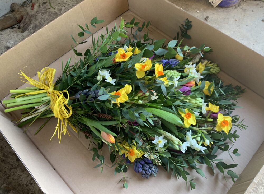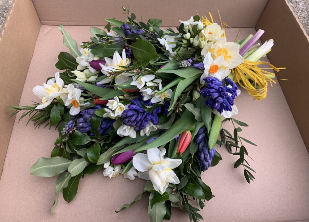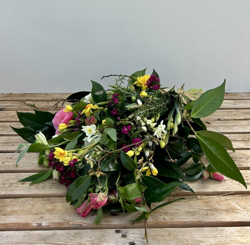 Our funeral sheaf is a beautiful collection of the best seasonal blooms and foliage that we have on the day of sending, arranged into a sheaf and tied with raffia. Our flowers are sent in bud and the sheaf will need a couple of days after arrival to open up and be looking its best for the day. If you are unsure which date to select as the dispatch date please give us a call on 01209 831704 and we can advise you.